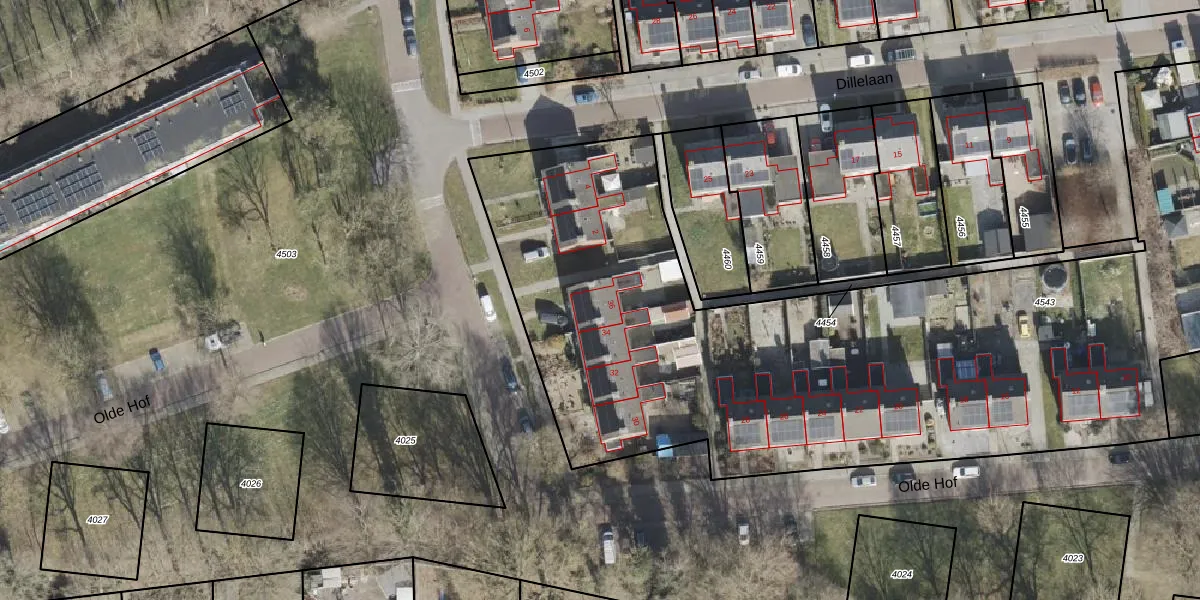 Het perceel waarop Olde Hof 36 staat heeft een oppervlakte van 5158 m². Dit is een zeer groot perceel. De perceeloppervlakte wordt geregistreerd door het Kadaster. Gedetailleerde informatie over de maten van dit perceel kunt u vinden in het rapport Kadastrale kaart met maatvoering van Olde Hof 36.