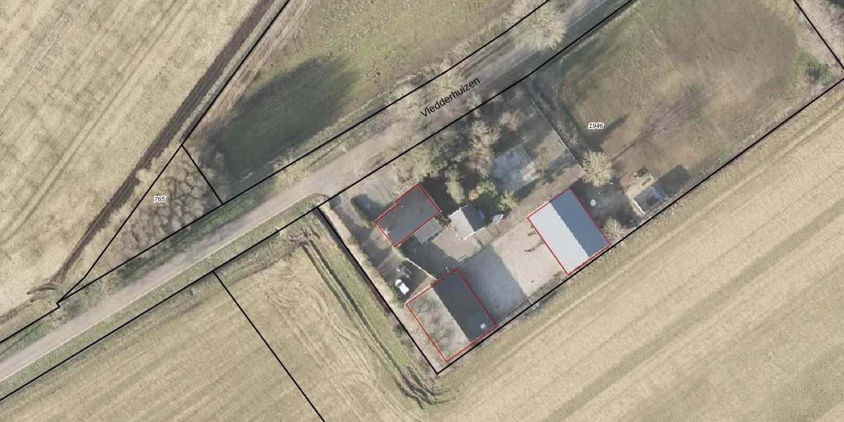 Het perceel waarop Vledderhuizen 2 staat heeft een oppervlakte van 5495 m². Dit is een zeer groot perceel. De perceeloppervlakte wordt geregistreerd door het Kadaster. Gedetailleerde informatie over de maten van dit perceel kunt u vinden in het rapport Kadastrale kaart met maatvoering van Vledderhuizen 2.