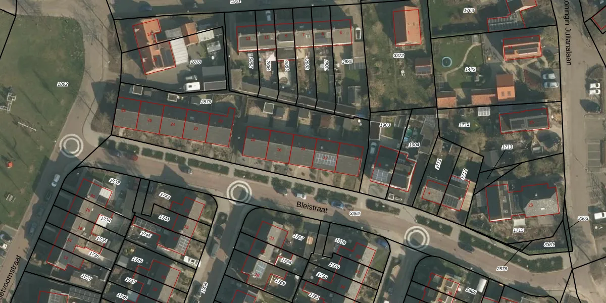 Bleistraat 14 is gelegen op kadastraal perceel OOI00B2879. Deze kadastrale aanduiding is uniek en wordt gebruikt door het Kadaster om eigendomsrechten en andere zakelijke rechten vast te leggen. Het perceel maakt onderdeel uit van de kadastrale gemeente Ooij.