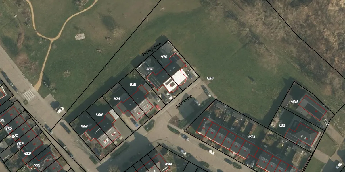 Het perceel waarop Boterkamp 3 staat heeft een oppervlakte van 357 m². Dit is een groot perceel. De perceeloppervlakte wordt geregistreerd door het Kadaster. Gedetailleerde informatie over de maten van dit perceel kunt u vinden in het rapport Kadastrale kaart met maatvoering van Boterkamp 3.