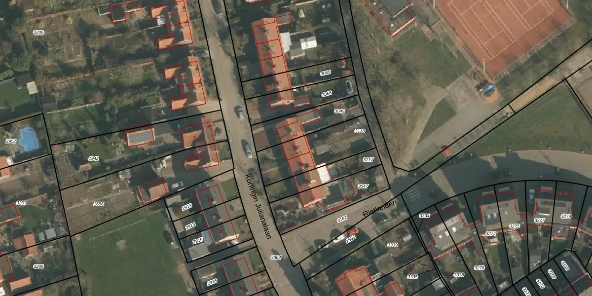 Het perceel waarop Koningin Julianalaan 60 staat heeft een oppervlakte van 469 m². Dit is een groot perceel. De perceeloppervlakte wordt geregistreerd door het Kadaster. Gedetailleerde informatie over de maten van dit perceel kunt u vinden in het rapport Kadastrale kaart met maatvoering van Koningin Julianalaan 60.