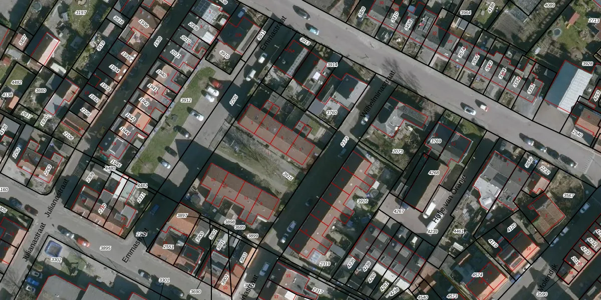 Het perceel waarop Emmastraat 7 staat heeft een oppervlakte van 1403 m². Dit is een zeer groot perceel. De perceeloppervlakte wordt geregistreerd door het Kadaster. Gedetailleerde informatie over de maten van dit perceel kunt u vinden in het rapport Kadastrale kaart met maatvoering van Emmastraat 7.