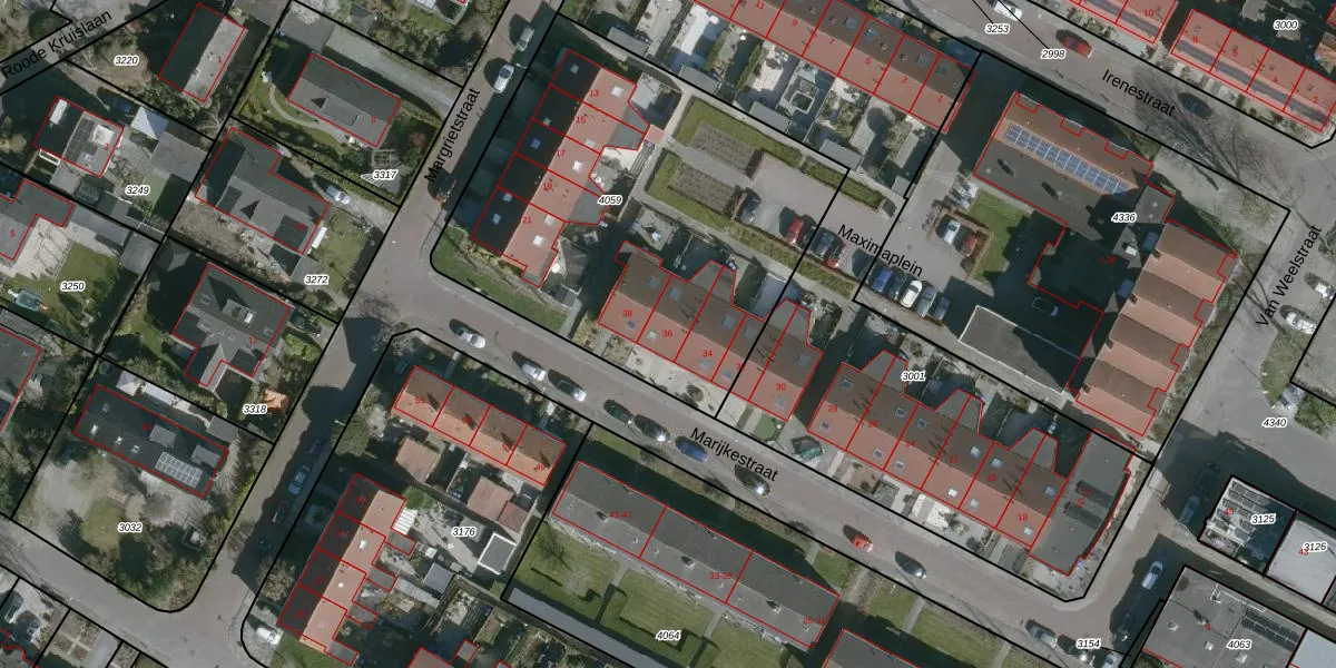 Het perceel waarop Marijkestraat 36 staat heeft een oppervlakte van 2100 m². Dit is een zeer groot perceel. De perceeloppervlakte wordt geregistreerd door het Kadaster. Gedetailleerde informatie over de maten van dit perceel kunt u vinden in het rapport Kadastrale kaart met maatvoering van Marijkestraat 36.