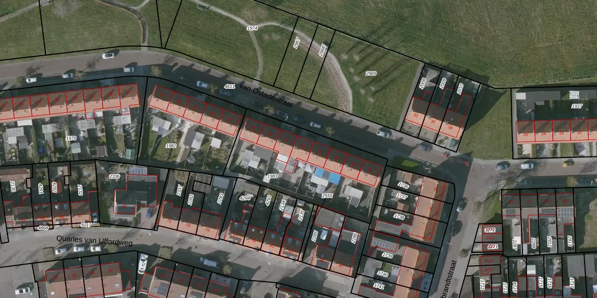 Het perceel waarop van Ostadestraat 39 staat heeft een oppervlakte van 1157 m². Dit is een zeer groot perceel. De perceeloppervlakte wordt geregistreerd door het Kadaster. Gedetailleerde informatie over de maten van dit perceel kunt u vinden in het rapport Kadastrale kaart met maatvoering van van Ostadestraat 39.
