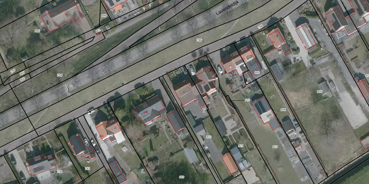 Het perceel waarop Lavendeldijk 17 staat heeft een oppervlakte van 841 m². Dit is een groot perceel. De perceeloppervlakte wordt geregistreerd door het Kadaster. Gedetailleerde informatie over de maten van dit perceel kunt u vinden in het rapport Kadastrale kaart met maatvoering van Lavendeldijk 17.