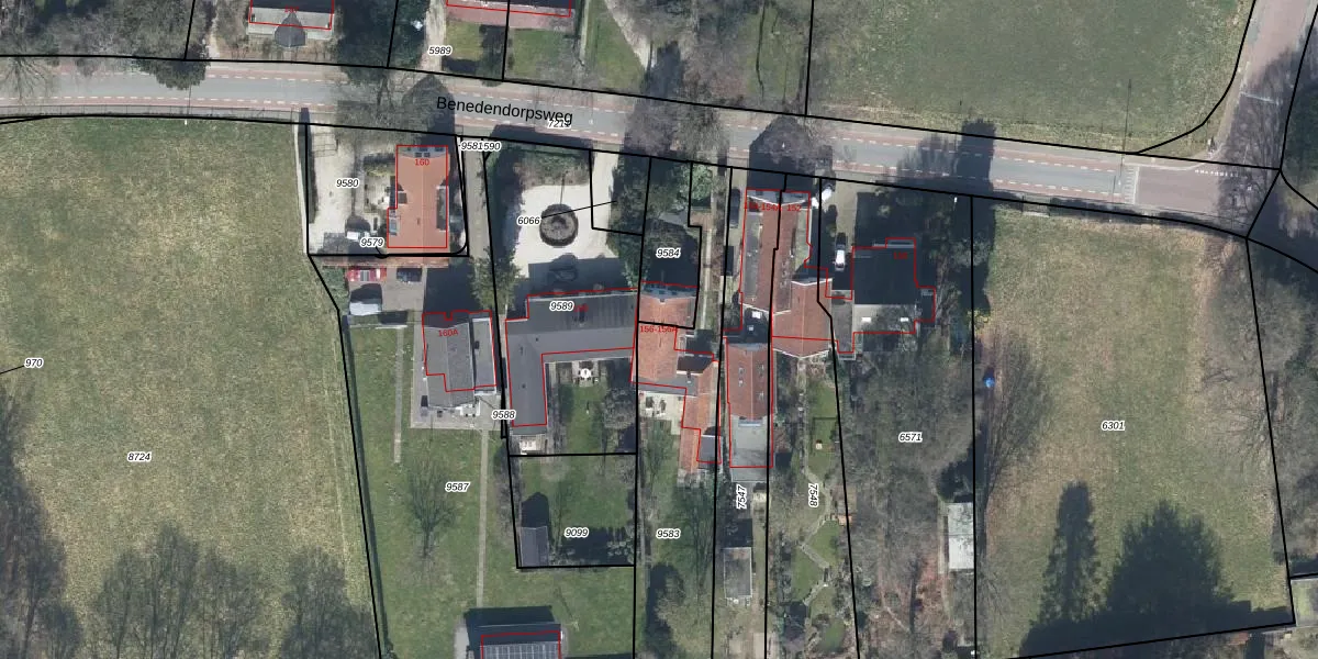 Benedendorpsweg 156 is gelegen op kadastraal perceel OTB00D9583. Deze kadastrale aanduiding is uniek en wordt gebruikt door het Kadaster om eigendomsrechten en andere zakelijke rechten vast te leggen. Het perceel maakt onderdeel uit van de kadastrale gemeente Oosterbeek.
