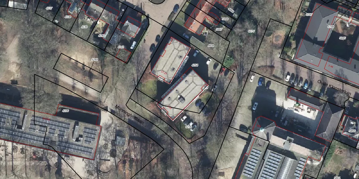Münninghofflaan 5 is gelegen op kadastraal perceel OTB00C4254. Deze kadastrale aanduiding is uniek en wordt gebruikt door het Kadaster om eigendomsrechten en andere zakelijke rechten vast te leggen. Het perceel maakt onderdeel uit van de kadastrale gemeente Oosterbeek.
