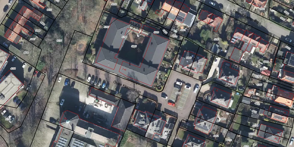 Het perceel waarop Oude Kloostertuin 46 staat heeft een oppervlakte van 2257 m². Dit is een zeer groot perceel. De perceeloppervlakte wordt geregistreerd door het Kadaster. Gedetailleerde informatie over de maten van dit perceel kunt u vinden in het rapport Kadastrale kaart met maatvoering van Oude Kloostertuin 46.