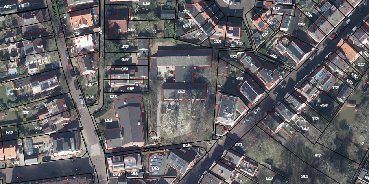 Het perceel waarop Postpad 1 staat heeft een oppervlakte van 1997 m². Dit is een zeer groot perceel. De perceeloppervlakte wordt geregistreerd door het Kadaster. Gedetailleerde informatie over de maten van dit perceel kunt u vinden in het rapport Kadastrale kaart met maatvoering van Postpad 1.