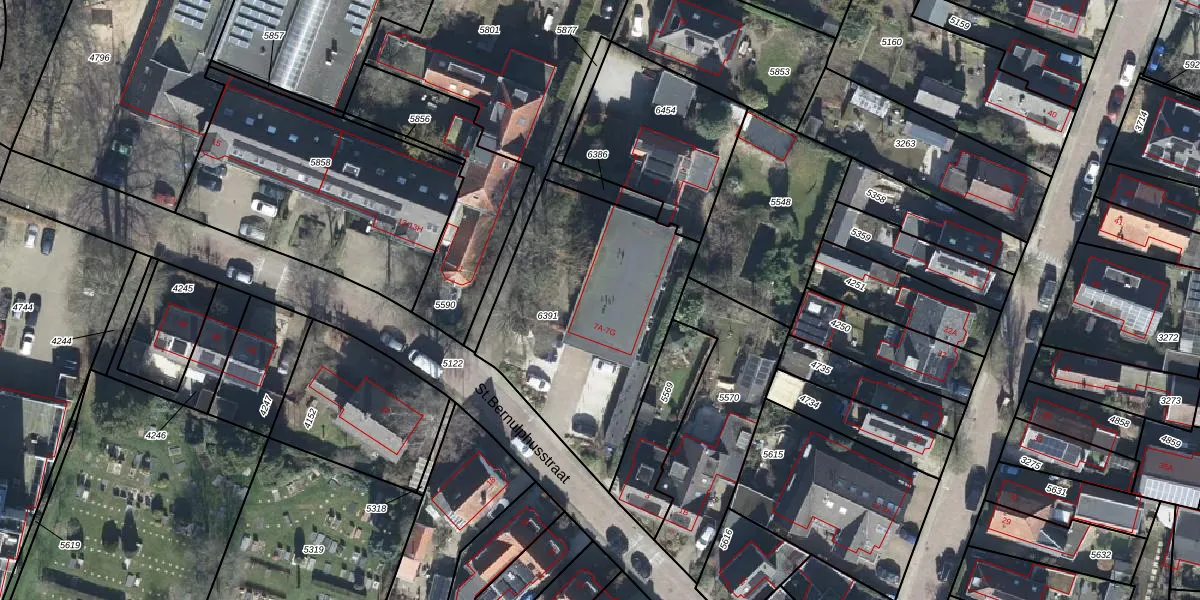 Het perceel waarop St.Bernulphusstraat 7-B staat heeft een oppervlakte van 1075 m². Dit is een zeer groot perceel. De perceeloppervlakte wordt geregistreerd door het Kadaster. Gedetailleerde informatie over de maten van dit perceel kunt u vinden in het rapport Kadastrale kaart met maatvoering van St.Bernulphusstraat 7-B.