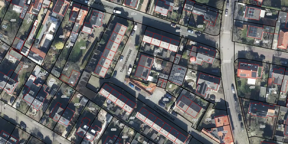 Het perceel waarop Transvaalstraat 5 staat heeft een oppervlakte van 438 m². Dit is een groot perceel. De perceeloppervlakte wordt geregistreerd door het Kadaster. Gedetailleerde informatie over de maten van dit perceel kunt u vinden in het rapport Kadastrale kaart met maatvoering van Transvaalstraat 5.