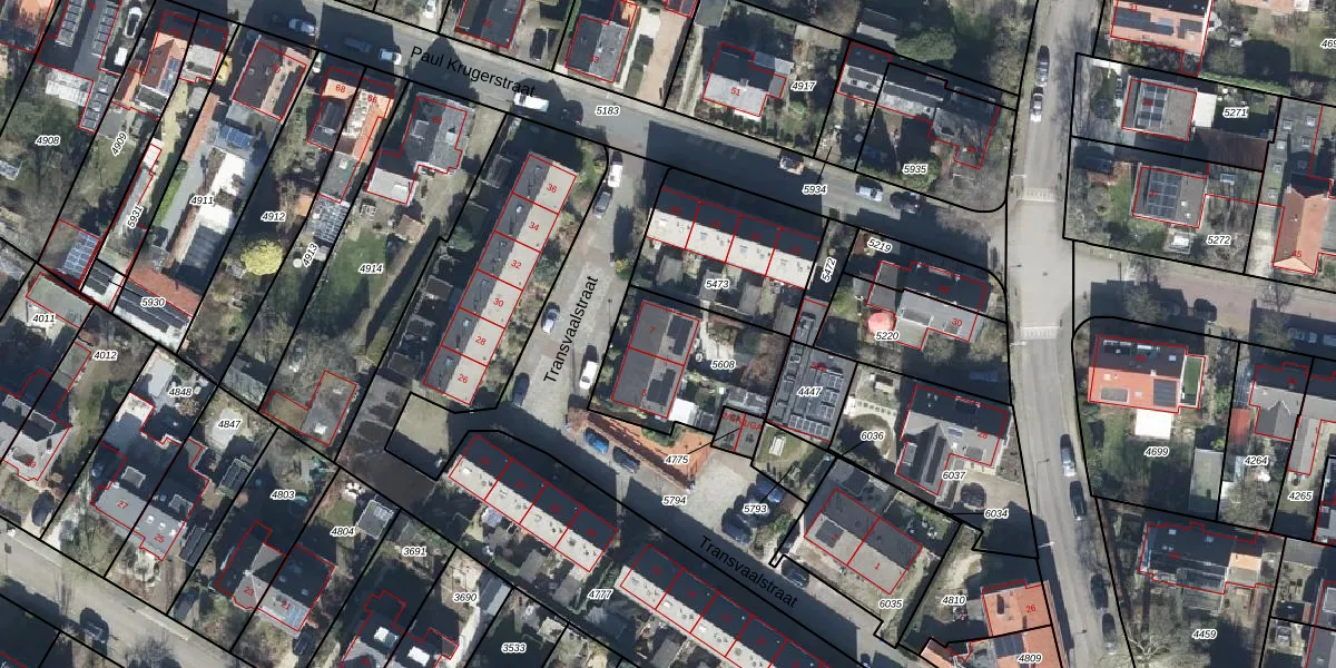 Het perceel waarop Transvaalstraat 7 staat heeft een oppervlakte van 438 m². Dit is een groot perceel. De perceeloppervlakte wordt geregistreerd door het Kadaster. Gedetailleerde informatie over de maten van dit perceel kunt u vinden in het rapport Kadastrale kaart met maatvoering van Transvaalstraat 7.