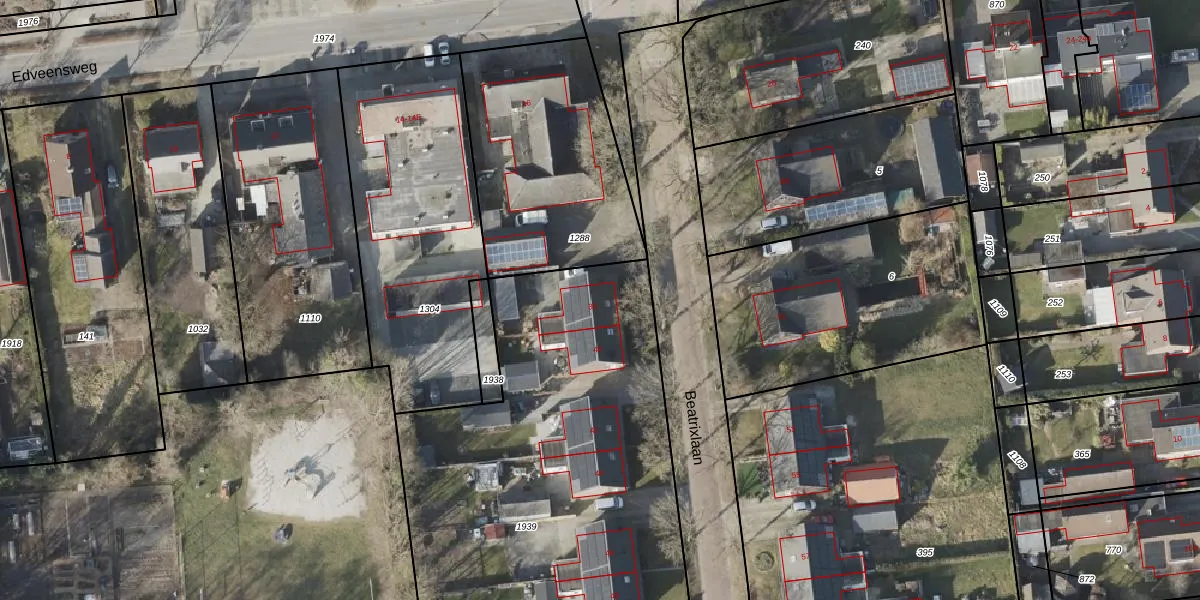 Het perceel waarop Beatrixlaan 38 staat heeft een oppervlakte van 2415 m². Dit is een zeer groot perceel. De perceeloppervlakte wordt geregistreerd door het Kadaster. Gedetailleerde informatie over de maten van dit perceel kunt u vinden in het rapport Kadastrale kaart met maatvoering van Beatrixlaan 38.