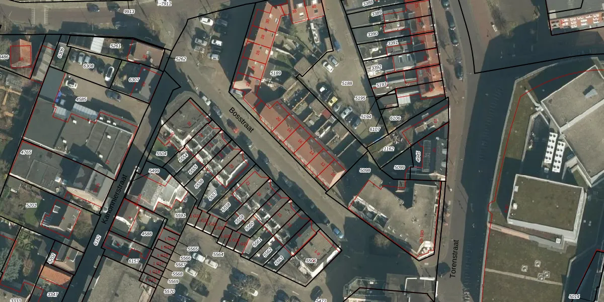 Het perceel waarop Bosstraat 14 staat heeft een oppervlakte van 1490 m². Dit is een zeer groot perceel. De perceeloppervlakte wordt geregistreerd door het Kadaster. Gedetailleerde informatie over de maten van dit perceel kunt u vinden in het rapport Kadastrale kaart met maatvoering van Bosstraat 14.