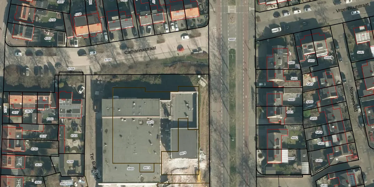 Het perceel waarop Catharinastraat 62 staat heeft een oppervlakte van 1566 m². Dit is een zeer groot perceel. De perceeloppervlakte wordt geregistreerd door het Kadaster. Gedetailleerde informatie over de maten van dit perceel kunt u vinden in het rapport Kadastrale kaart met maatvoering van Catharinastraat 62.