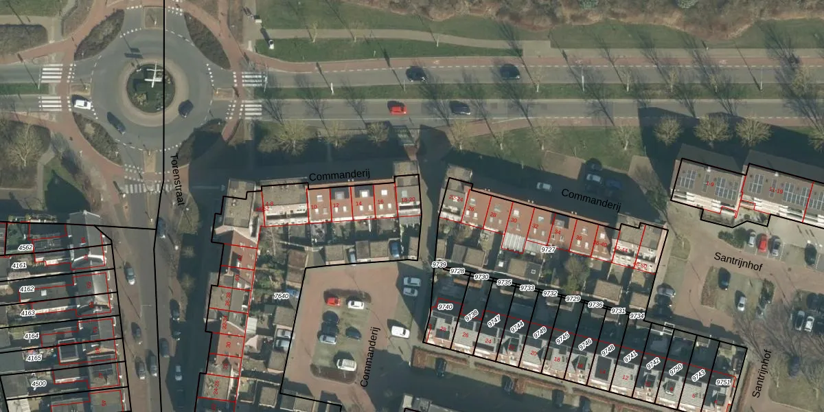 Het perceel waarop Commanderij 18 staat heeft een oppervlakte van 2185 m². Dit is een zeer groot perceel. De perceeloppervlakte wordt geregistreerd door het Kadaster. Gedetailleerde informatie over de maten van dit perceel kunt u vinden in het rapport Kadastrale kaart met maatvoering van Commanderij 18.