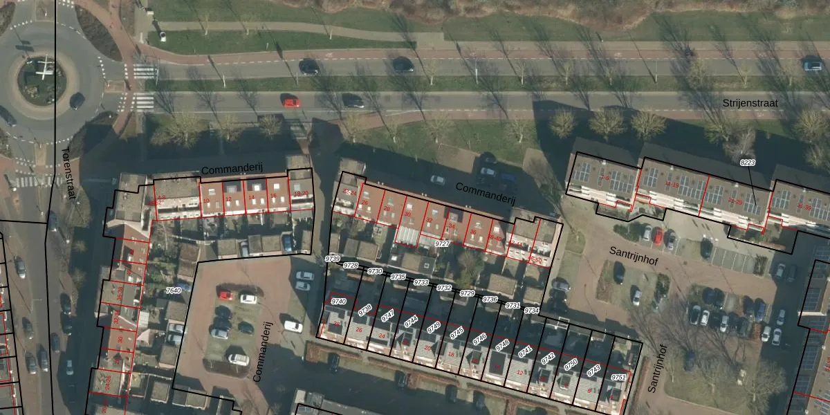 Het perceel waarop Commanderij 30 staat heeft een oppervlakte van 1034 m². Dit is een zeer groot perceel. De perceeloppervlakte wordt geregistreerd door het Kadaster. Gedetailleerde informatie over de maten van dit perceel kunt u vinden in het rapport Kadastrale kaart met maatvoering van Commanderij 30.