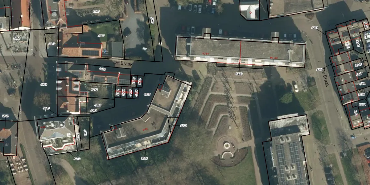 Het perceel waarop De Braak 46 staat heeft een oppervlakte van 920 m². Dit is een groot perceel. De perceeloppervlakte wordt geregistreerd door het Kadaster. Gedetailleerde informatie over de maten van dit perceel kunt u vinden in het rapport Kadastrale kaart met maatvoering van De Braak 46.