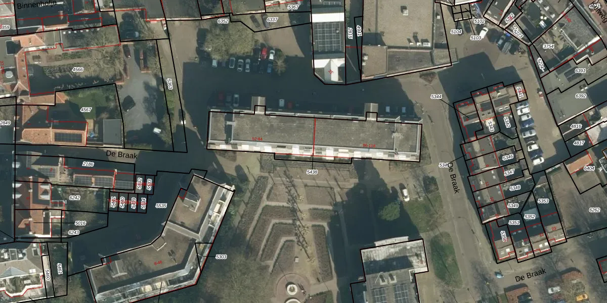 Het perceel waarop De Braak 54 staat heeft een oppervlakte van 946 m². Dit is een groot perceel. De perceeloppervlakte wordt geregistreerd door het Kadaster. Gedetailleerde informatie over de maten van dit perceel kunt u vinden in het rapport Kadastrale kaart met maatvoering van De Braak 54.
