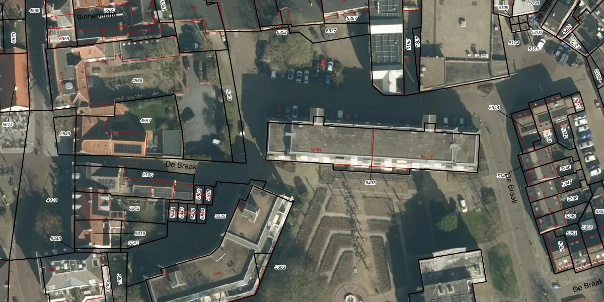 Het perceel waarop De Braak 56 staat heeft een oppervlakte van 946 m². Dit is een groot perceel. De perceeloppervlakte wordt geregistreerd door het Kadaster. Gedetailleerde informatie over de maten van dit perceel kunt u vinden in het rapport Kadastrale kaart met maatvoering van De Braak 56.