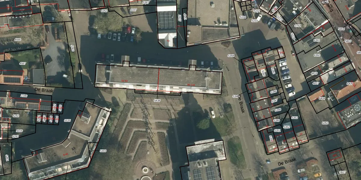 Het perceel waarop De Braak 86 staat heeft een oppervlakte van 946 m². Dit is een groot perceel. De perceeloppervlakte wordt geregistreerd door het Kadaster. Gedetailleerde informatie over de maten van dit perceel kunt u vinden in het rapport Kadastrale kaart met maatvoering van De Braak 86.