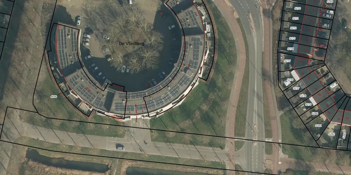 Het perceel waarop De Vliedberg 16 staat heeft een oppervlakte van 1256 m². Dit is een zeer groot perceel. De perceeloppervlakte wordt geregistreerd door het Kadaster. Gedetailleerde informatie over de maten van dit perceel kunt u vinden in het rapport Kadastrale kaart met maatvoering van De Vliedberg 16.