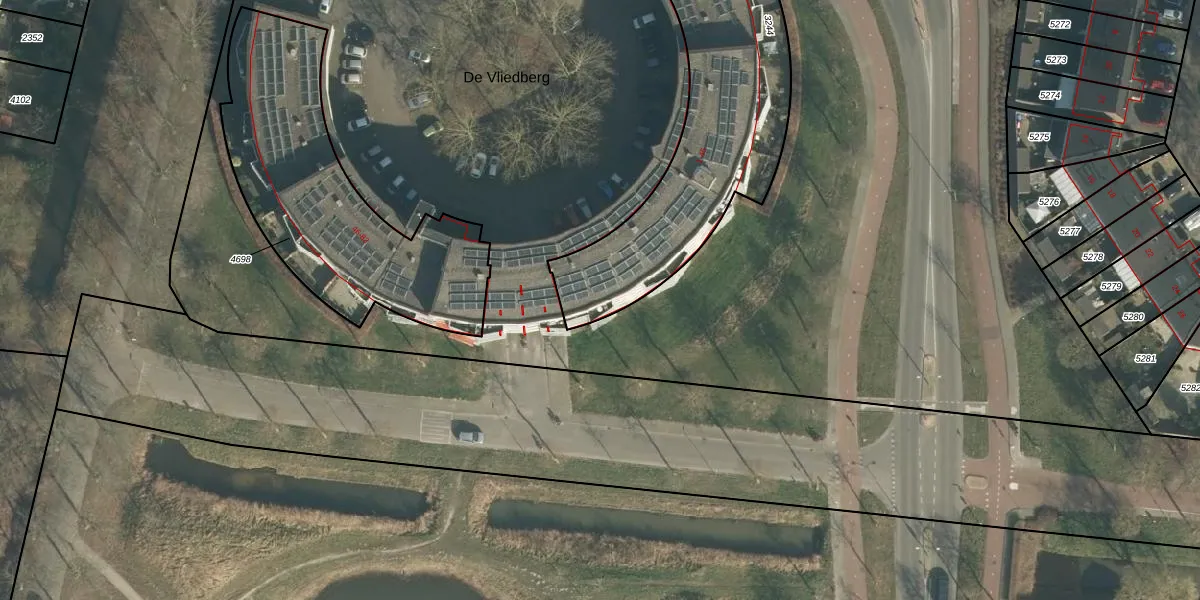 Het perceel waarop De Vliedberg 45 staat heeft een oppervlakte van 1256 m². Dit is een zeer groot perceel. De perceeloppervlakte wordt geregistreerd door het Kadaster. Gedetailleerde informatie over de maten van dit perceel kunt u vinden in het rapport Kadastrale kaart met maatvoering van De Vliedberg 45.