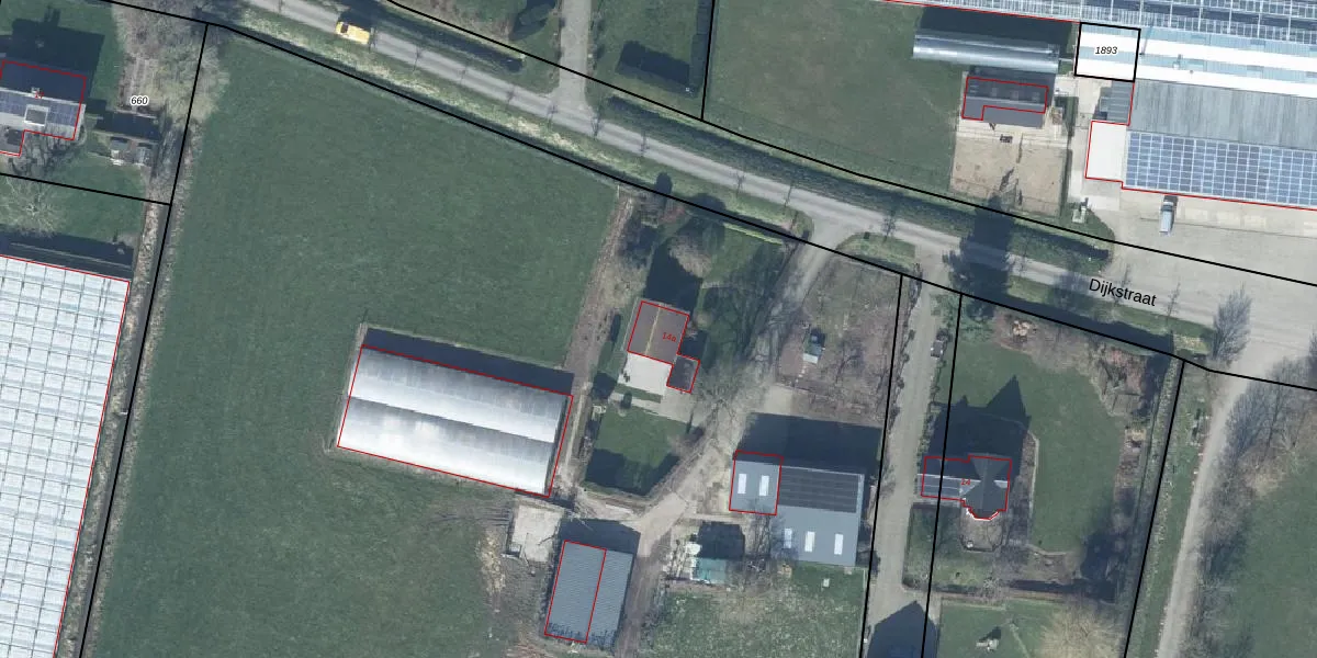 Het perceel waarop Dijkstraat 14-a staat heeft een oppervlakte van 2,0 ha. Dit is een zeer groot perceel. De perceeloppervlakte wordt geregistreerd door het Kadaster. Gedetailleerde informatie over de maten van dit perceel kunt u vinden in het rapport Kadastrale kaart met maatvoering van Dijkstraat 14-a.