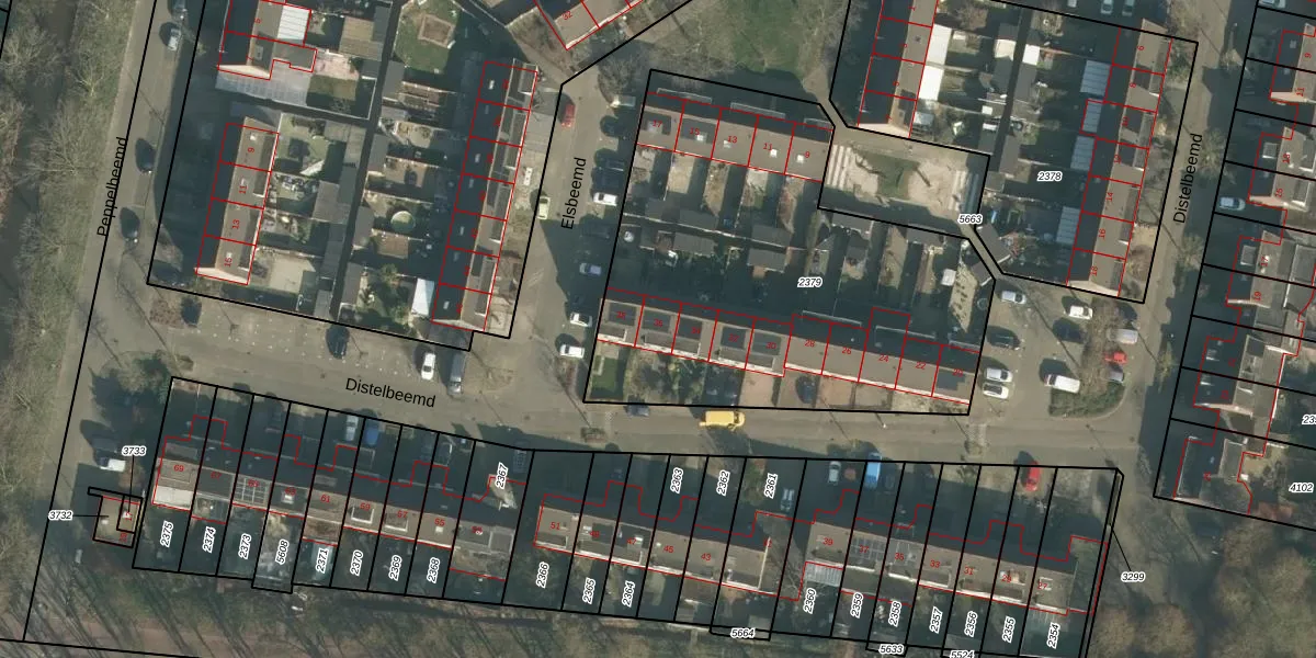 Het perceel waarop Distelbeemd 36 staat heeft een oppervlakte van 2228 m². Dit is een zeer groot perceel. De perceeloppervlakte wordt geregistreerd door het Kadaster. Gedetailleerde informatie over de maten van dit perceel kunt u vinden in het rapport Kadastrale kaart met maatvoering van Distelbeemd 36.