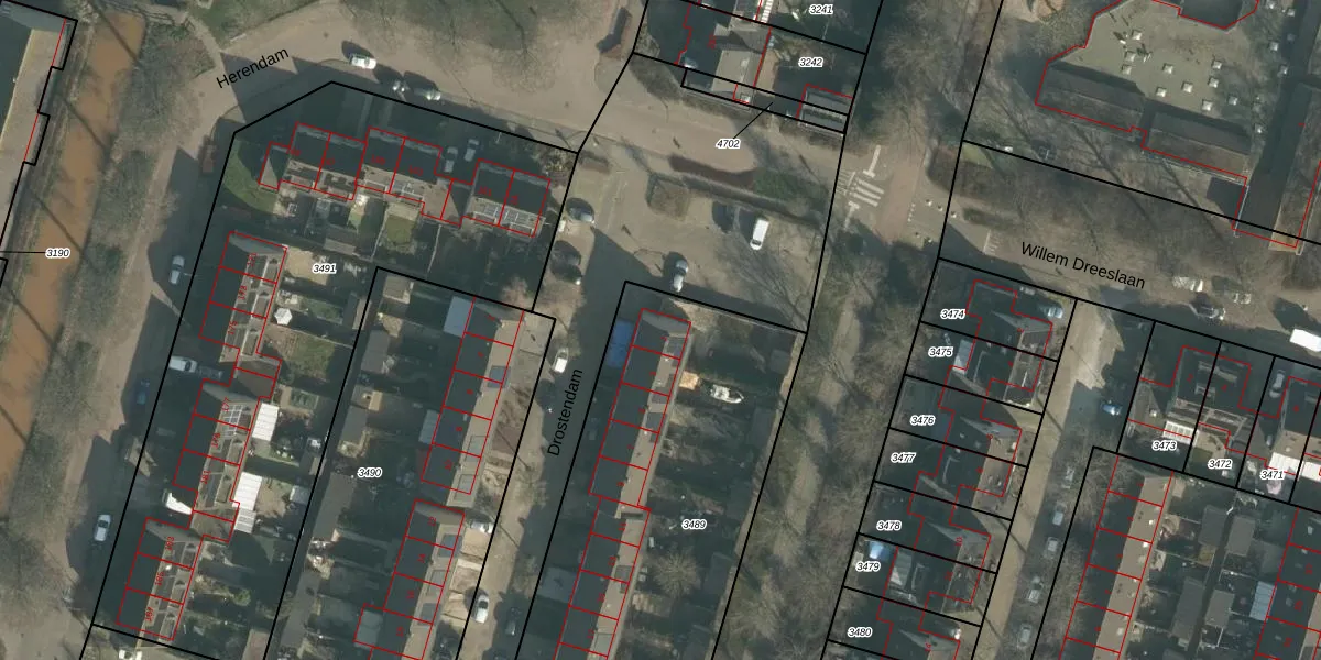 Het perceel waarop Drostendam 1 staat heeft een oppervlakte van 2007 m². Dit is een zeer groot perceel. De perceeloppervlakte wordt geregistreerd door het Kadaster. Gedetailleerde informatie over de maten van dit perceel kunt u vinden in het rapport Kadastrale kaart met maatvoering van Drostendam 1.