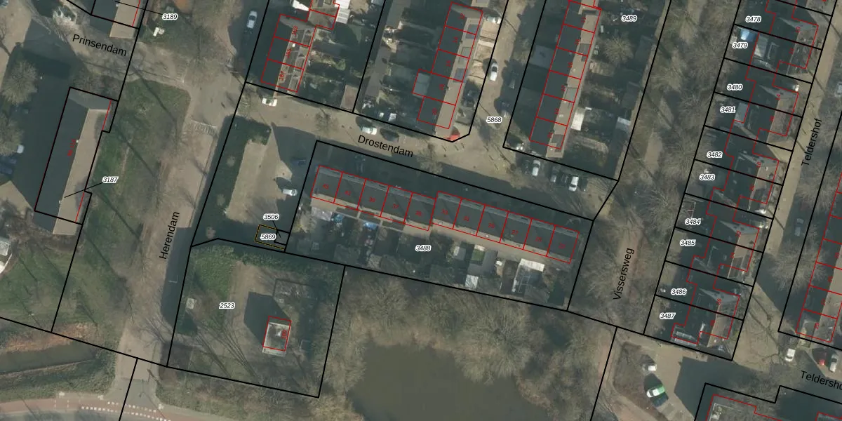 Het perceel waarop Drostendam 35 staat heeft een oppervlakte van 1713 m². Dit is een zeer groot perceel. De perceeloppervlakte wordt geregistreerd door het Kadaster. Gedetailleerde informatie over de maten van dit perceel kunt u vinden in het rapport Kadastrale kaart met maatvoering van Drostendam 35.
