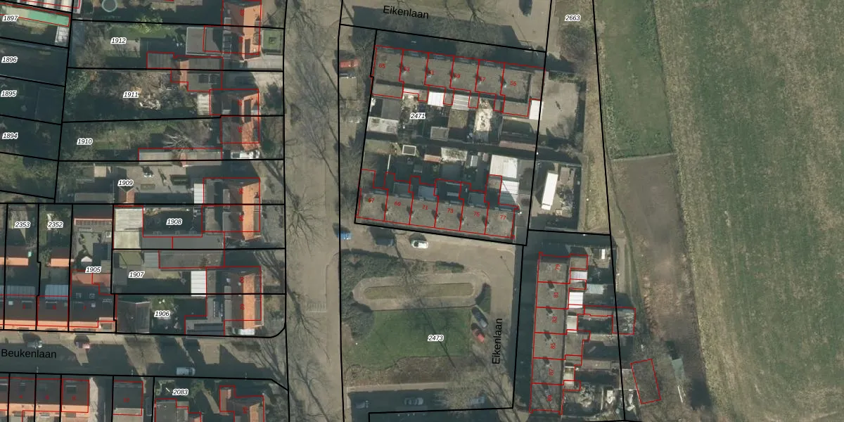 Het perceel waarop Eikenlaan 71 staat heeft een oppervlakte van 1890 m². Dit is een zeer groot perceel. De perceeloppervlakte wordt geregistreerd door het Kadaster. Gedetailleerde informatie over de maten van dit perceel kunt u vinden in het rapport Kadastrale kaart met maatvoering van Eikenlaan 71.