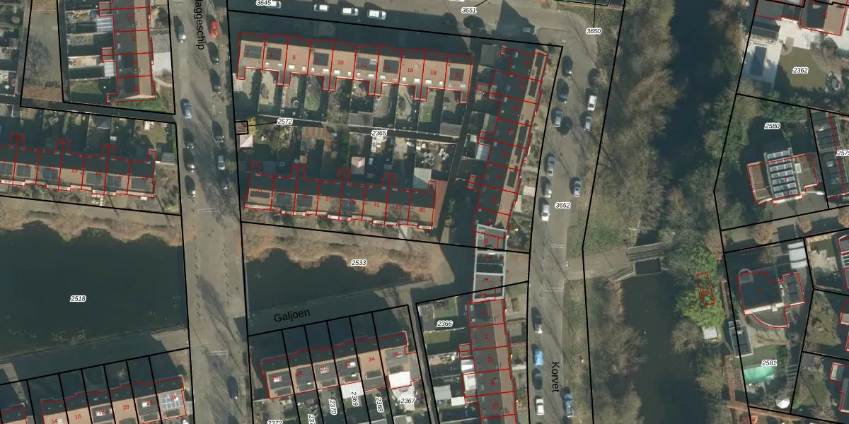 Het perceel waarop Galjoen 35 staat heeft een oppervlakte van 3600 m². Dit is een zeer groot perceel. De perceeloppervlakte wordt geregistreerd door het Kadaster. Gedetailleerde informatie over de maten van dit perceel kunt u vinden in het rapport Kadastrale kaart met maatvoering van Galjoen 35.