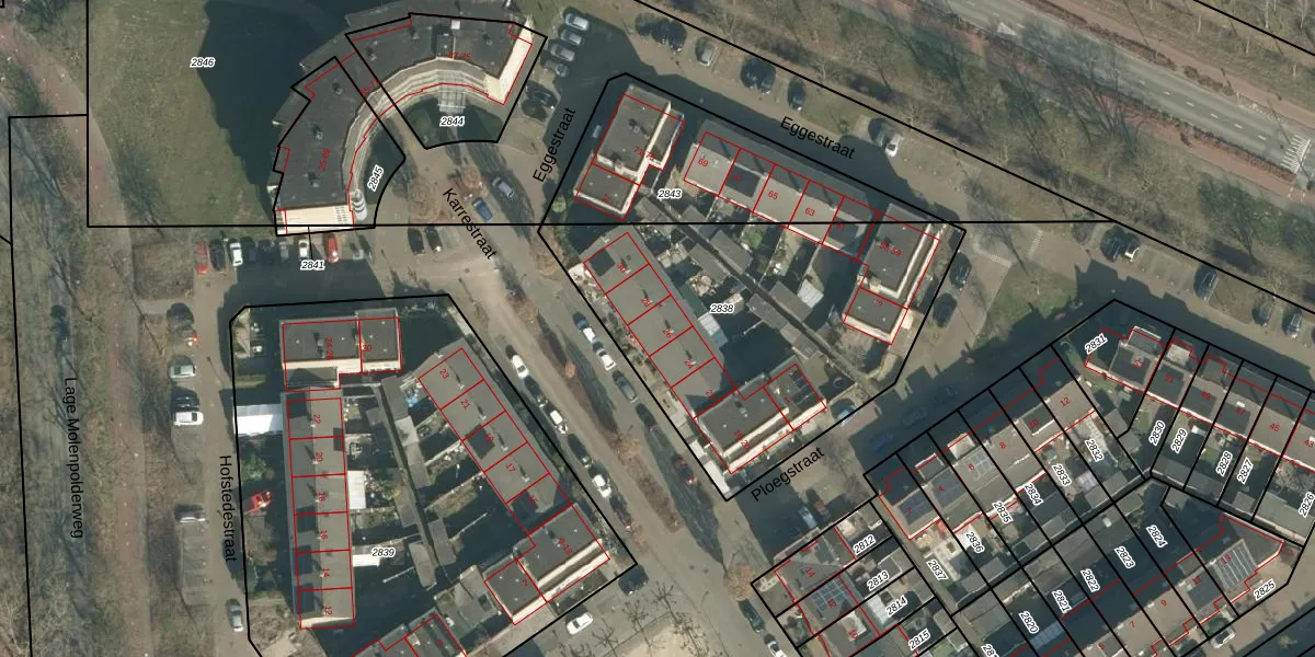 Het perceel waarop Karrestraat 26 staat heeft een oppervlakte van 1613 m². Dit is een zeer groot perceel. De perceeloppervlakte wordt geregistreerd door het Kadaster. Gedetailleerde informatie over de maten van dit perceel kunt u vinden in het rapport Kadastrale kaart met maatvoering van Karrestraat 26.