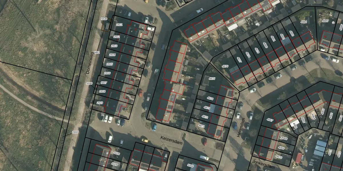 Het perceel waarop Keizersdam 10 staat heeft een oppervlakte van 4718 m². Dit is een zeer groot perceel. De perceeloppervlakte wordt geregistreerd door het Kadaster. Gedetailleerde informatie over de maten van dit perceel kunt u vinden in het rapport Kadastrale kaart met maatvoering van Keizersdam 10.