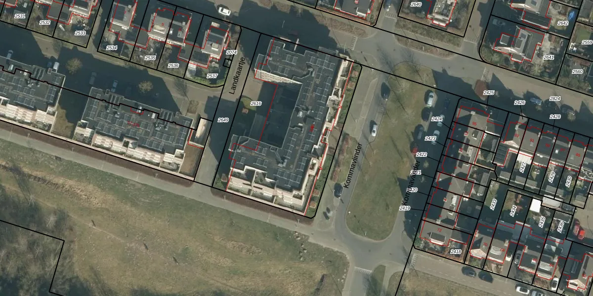 Kommavlinder 25 is gelegen op kadastraal perceel OTH01P2616. Deze kadastrale aanduiding is uniek en wordt gebruikt door het Kadaster om eigendomsrechten en andere zakelijke rechten vast te leggen. Het perceel maakt onderdeel uit van de kadastrale gemeente Oosterhout.