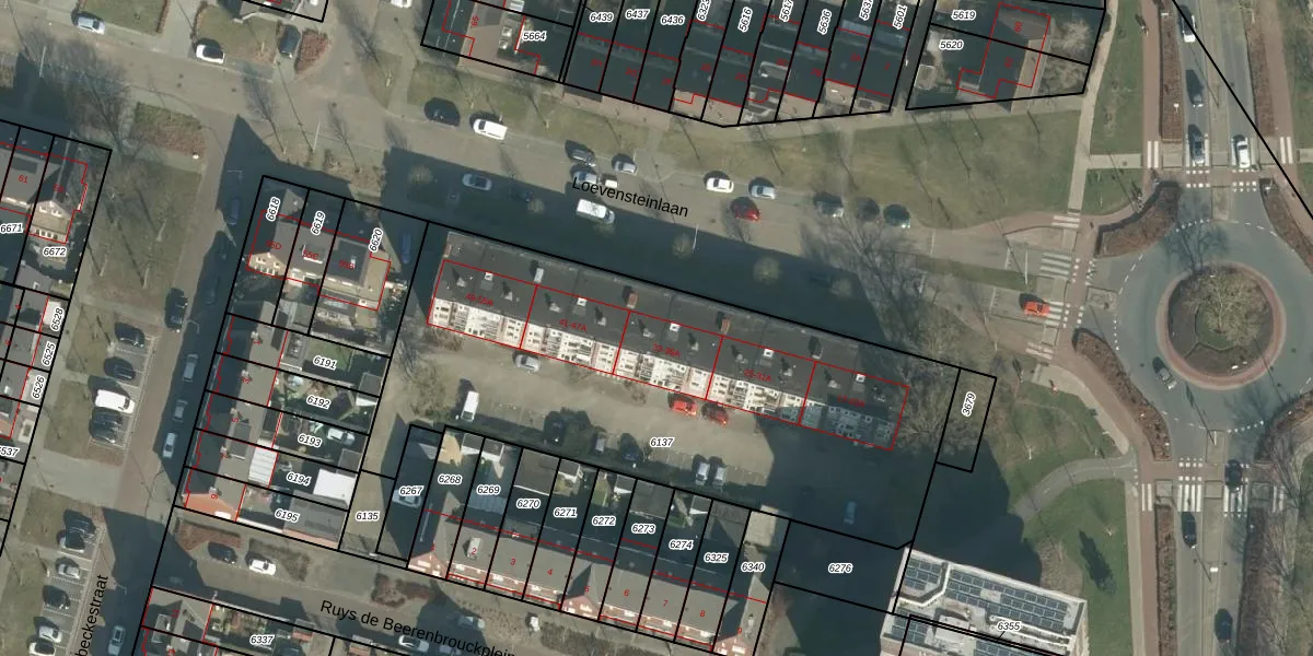Het perceel waarop Loevensteinlaan 33 staat heeft een oppervlakte van 2520 m². Dit is een zeer groot perceel. De perceeloppervlakte wordt geregistreerd door het Kadaster. Gedetailleerde informatie over de maten van dit perceel kunt u vinden in het rapport Kadastrale kaart met maatvoering van Loevensteinlaan 33.