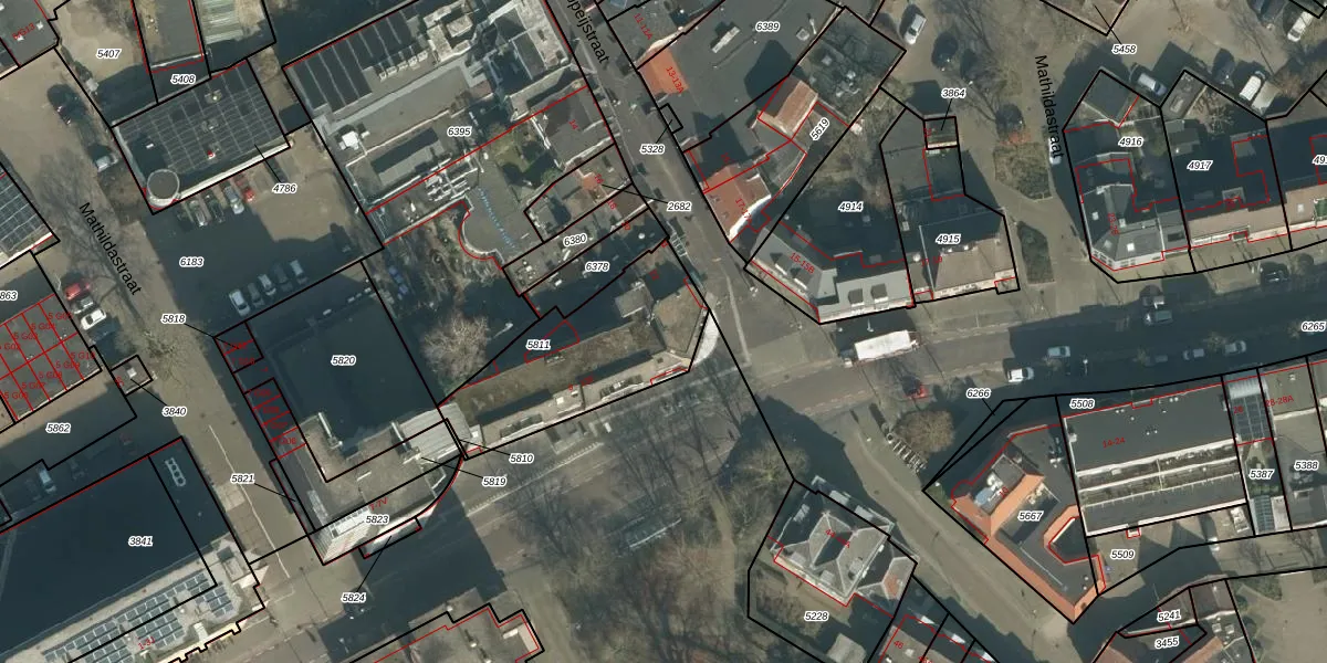 Het perceel waarop Mathildastraat 13-E staat heeft een oppervlakte van 617 m². Dit is een groot perceel. De perceeloppervlakte wordt geregistreerd door het Kadaster. Gedetailleerde informatie over de maten van dit perceel kunt u vinden in het rapport Kadastrale kaart met maatvoering van Mathildastraat 13-E.
