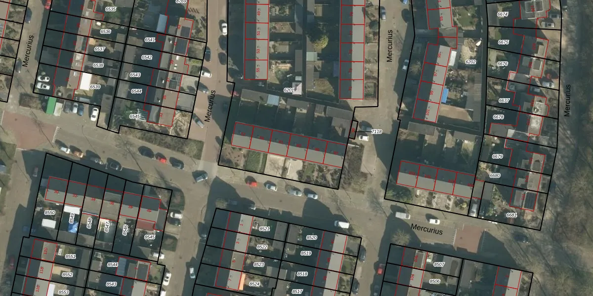 Het perceel waarop Mercurius 63 staat heeft een oppervlakte van 3568 m². Dit is een zeer groot perceel. De perceeloppervlakte wordt geregistreerd door het Kadaster. Gedetailleerde informatie over de maten van dit perceel kunt u vinden in het rapport Kadastrale kaart met maatvoering van Mercurius 63.