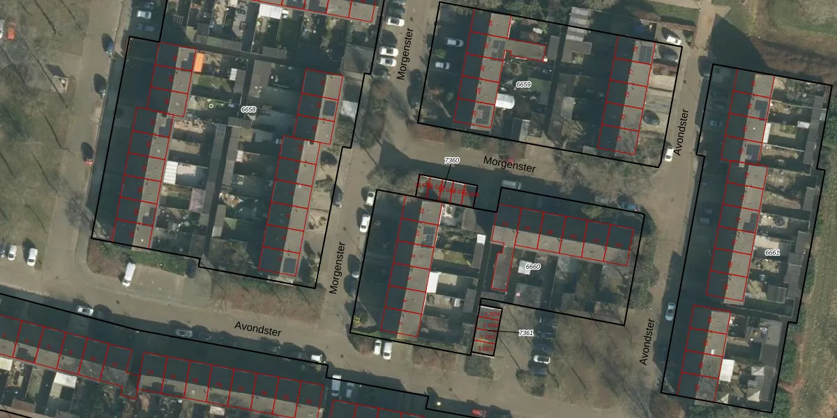 Het perceel waarop Morgenster 12 staat heeft een oppervlakte van 1956 m². Dit is een zeer groot perceel. De perceeloppervlakte wordt geregistreerd door het Kadaster. Gedetailleerde informatie over de maten van dit perceel kunt u vinden in het rapport Kadastrale kaart met maatvoering van Morgenster 12.