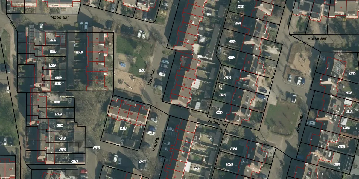 Het perceel waarop Nobelaar 39 staat heeft een oppervlakte van 2024 m². Dit is een zeer groot perceel. De perceeloppervlakte wordt geregistreerd door het Kadaster. Gedetailleerde informatie over de maten van dit perceel kunt u vinden in het rapport Kadastrale kaart met maatvoering van Nobelaar 39.