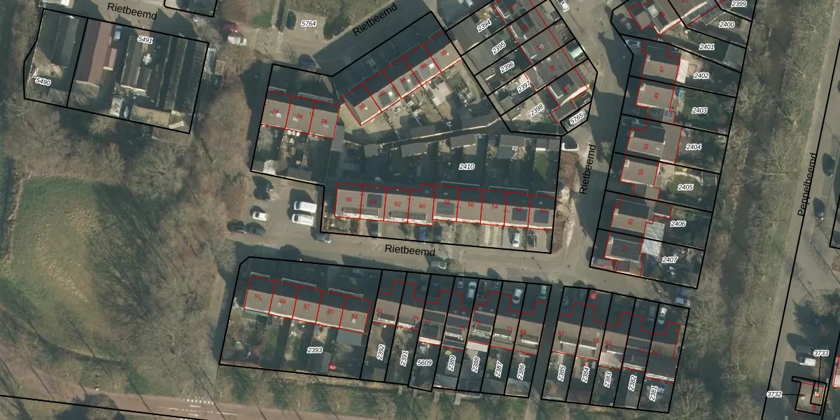 Het perceel waarop Rietbeemd 60 staat heeft een oppervlakte van 2650 m². Dit is een zeer groot perceel. De perceeloppervlakte wordt geregistreerd door het Kadaster. Gedetailleerde informatie over de maten van dit perceel kunt u vinden in het rapport Kadastrale kaart met maatvoering van Rietbeemd 60.
