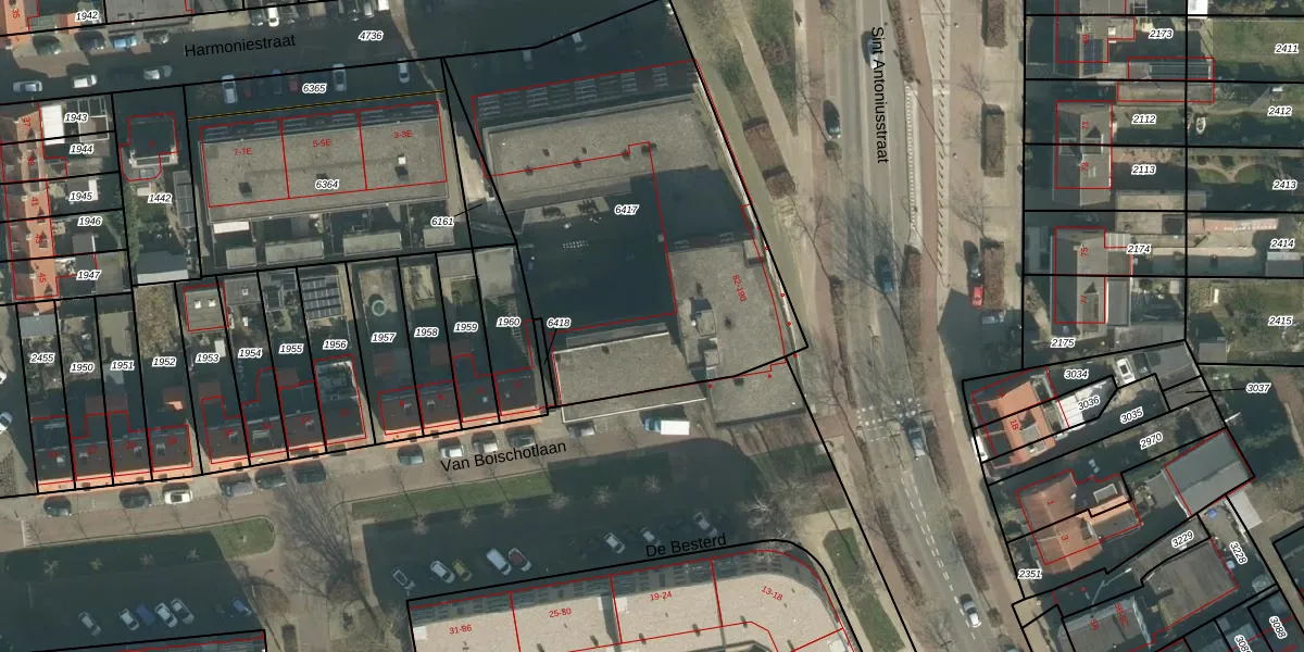 Het perceel waarop Sint Antoniusstraat 86 staat heeft een oppervlakte van 2096 m². Dit is een zeer groot perceel. De perceeloppervlakte wordt geregistreerd door het Kadaster. Gedetailleerde informatie over de maten van dit perceel kunt u vinden in het rapport Kadastrale kaart met maatvoering van Sint Antoniusstraat 86.
