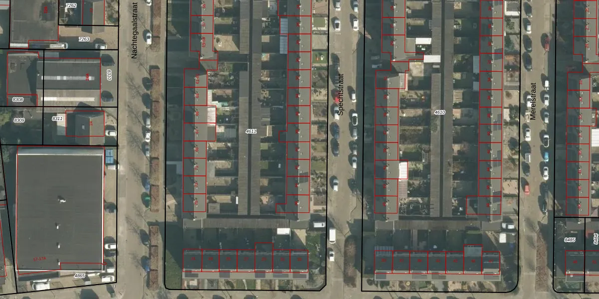 Het perceel waarop Spechtstraat 40 staat heeft een oppervlakte van 5601 m². Dit is een zeer groot perceel. De perceeloppervlakte wordt geregistreerd door het Kadaster. Gedetailleerde informatie over de maten van dit perceel kunt u vinden in het rapport Kadastrale kaart met maatvoering van Spechtstraat 40.