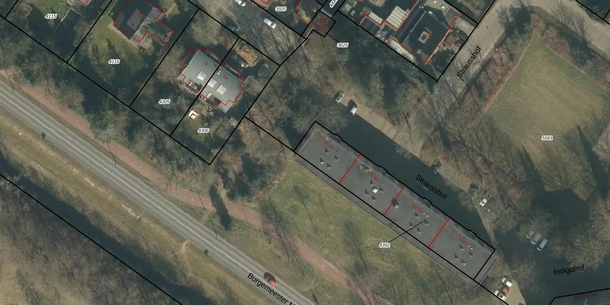 Het perceel waarop Strausshof 93 staat heeft een oppervlakte van 891 m². Dit is een groot perceel. De perceeloppervlakte wordt geregistreerd door het Kadaster. Gedetailleerde informatie over de maten van dit perceel kunt u vinden in het rapport Kadastrale kaart met maatvoering van Strausshof 93.