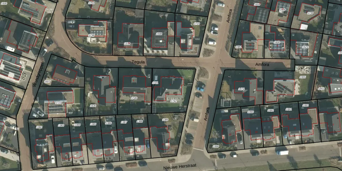 Het perceel waarop Tegula 1 staat heeft een oppervlakte van 595 m². Dit is een groot perceel. De perceeloppervlakte wordt geregistreerd door het Kadaster. Gedetailleerde informatie over de maten van dit perceel kunt u vinden in het rapport Kadastrale kaart met maatvoering van Tegula 1.