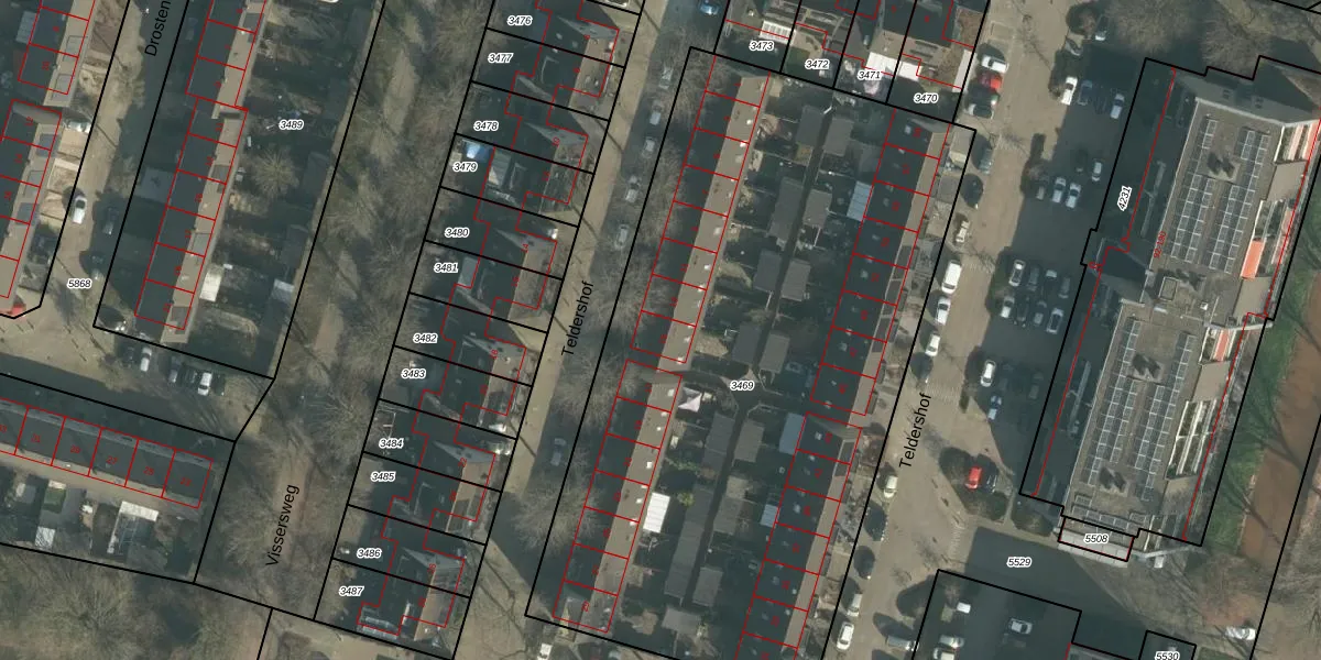 Het perceel waarop Teldershof 15 staat heeft een oppervlakte van 4033 m². Dit is een zeer groot perceel. De perceeloppervlakte wordt geregistreerd door het Kadaster. Gedetailleerde informatie over de maten van dit perceel kunt u vinden in het rapport Kadastrale kaart met maatvoering van Teldershof 15.