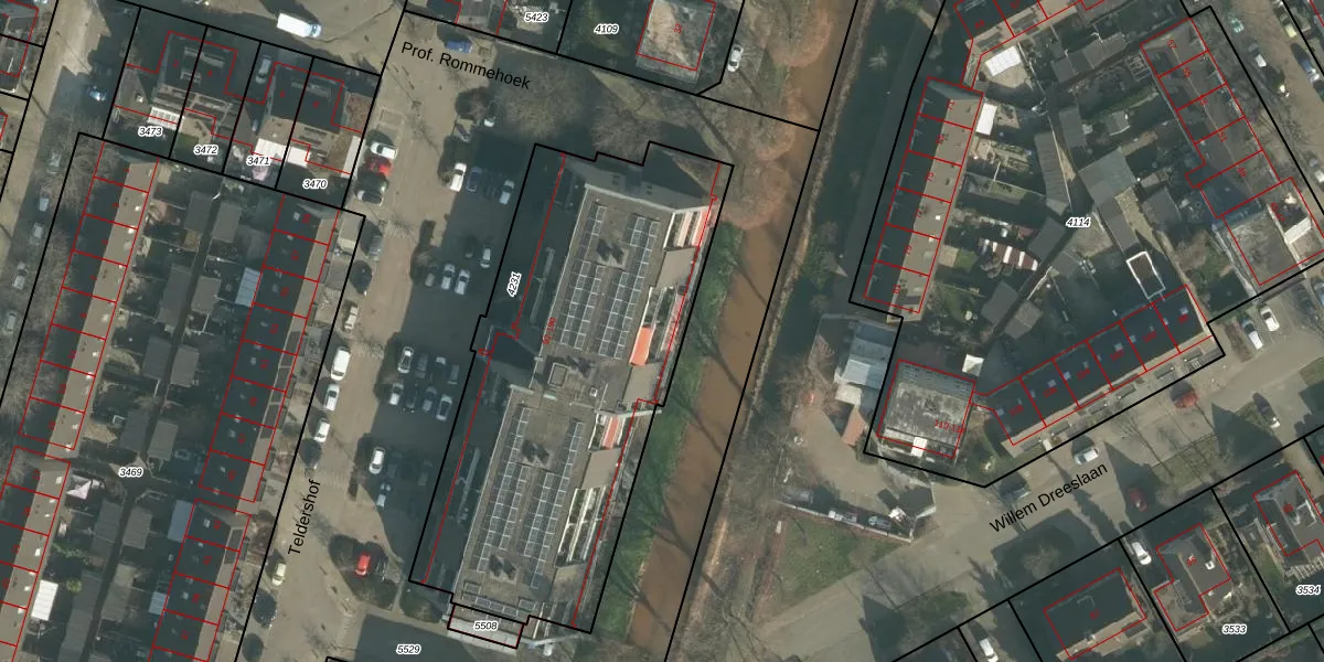 Het perceel waarop Teldershof 182 staat heeft een oppervlakte van 2093 m². Dit is een zeer groot perceel. De perceeloppervlakte wordt geregistreerd door het Kadaster. Gedetailleerde informatie over de maten van dit perceel kunt u vinden in het rapport Kadastrale kaart met maatvoering van Teldershof 182.