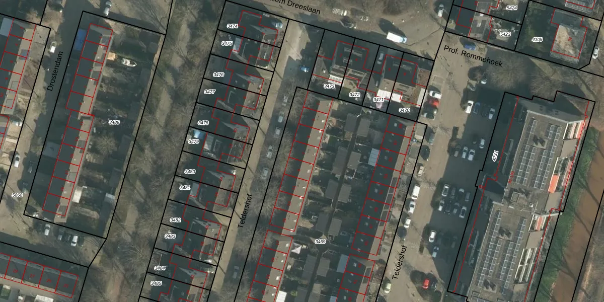 Het perceel waarop Teldershof 7 staat heeft een oppervlakte van 4033 m². Dit is een zeer groot perceel. De perceeloppervlakte wordt geregistreerd door het Kadaster. Gedetailleerde informatie over de maten van dit perceel kunt u vinden in het rapport Kadastrale kaart met maatvoering van Teldershof 7.