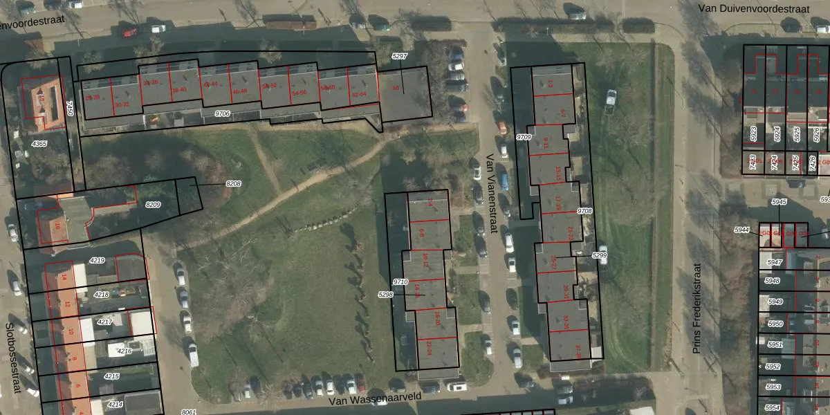 Het perceel waarop Van Vianenstraat 4 staat heeft een oppervlakte van 418 m². Dit is een groot perceel. De perceeloppervlakte wordt geregistreerd door het Kadaster. Gedetailleerde informatie over de maten van dit perceel kunt u vinden in het rapport Kadastrale kaart met maatvoering van Van Vianenstraat 4.